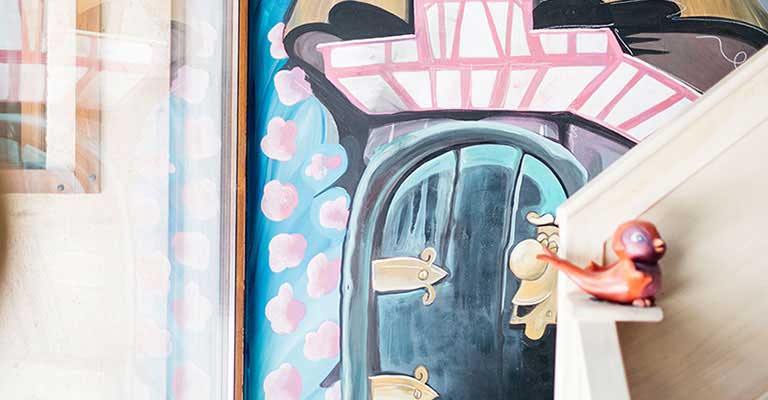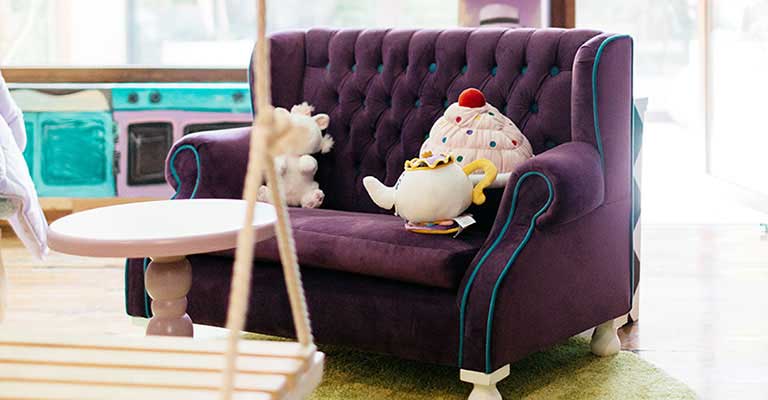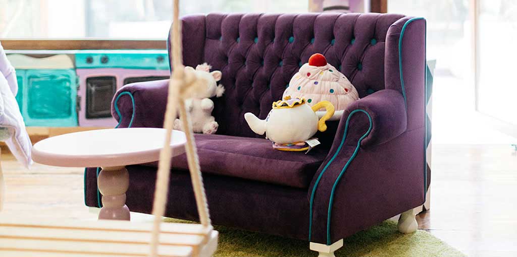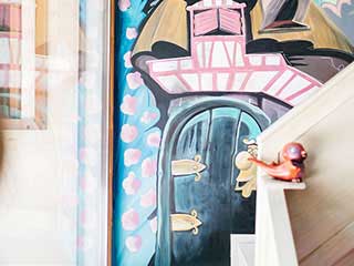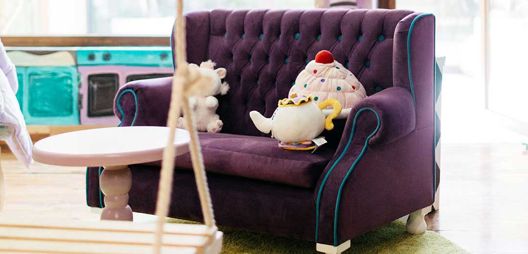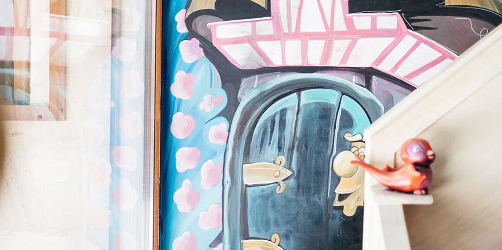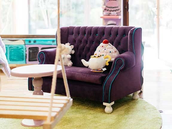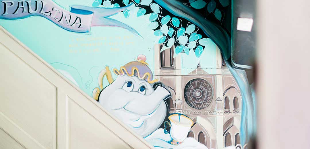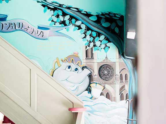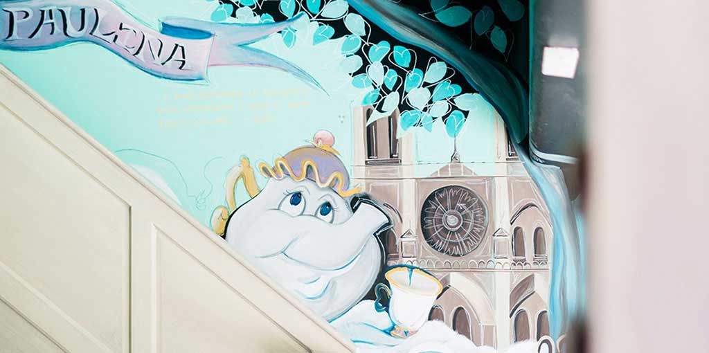 Speaking a little more about Paris, we included elements such as macarons, chairs decorated in gold, a beautiful chandelier, satin curtains ... All its architecture and pastel colors served as inspiration for the mural, making the space look and feel like our beloved Paris, undoubtedly an exquisite place to play and dream.