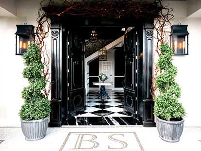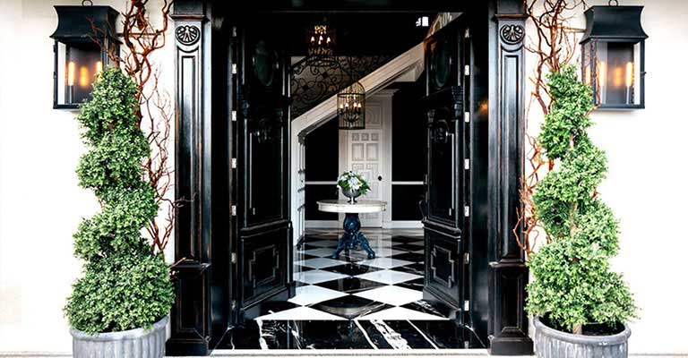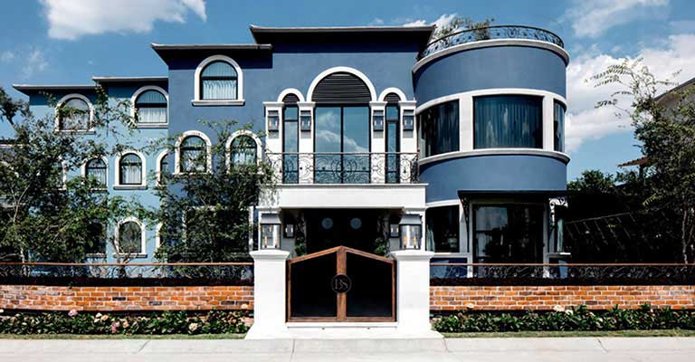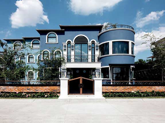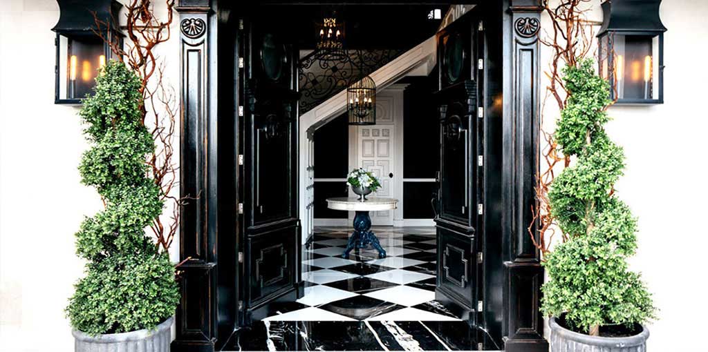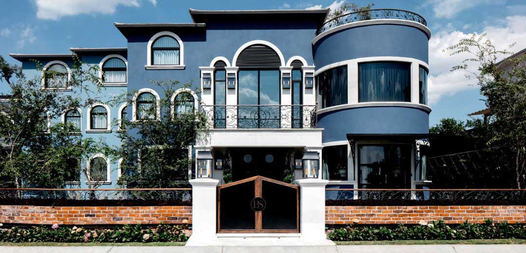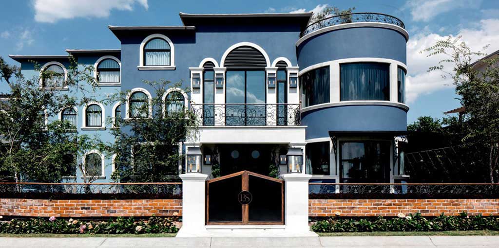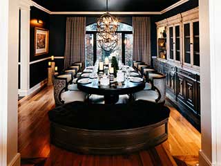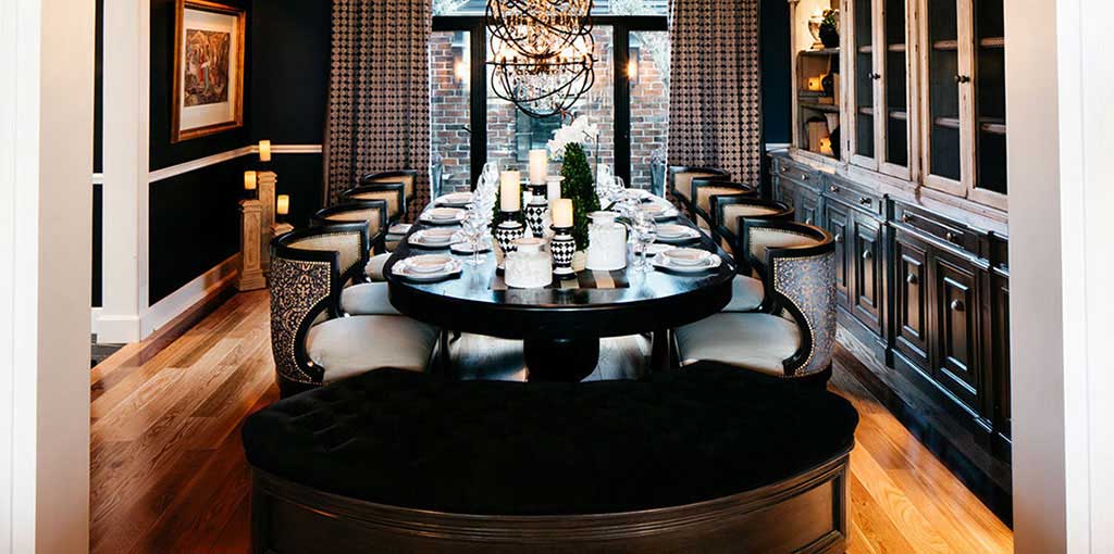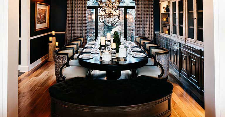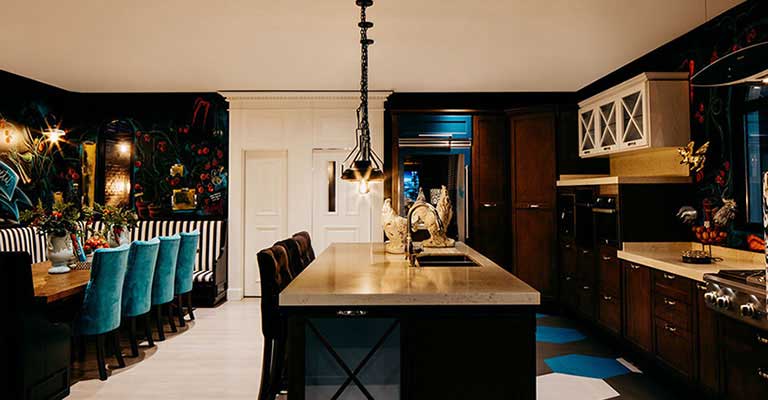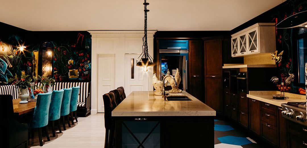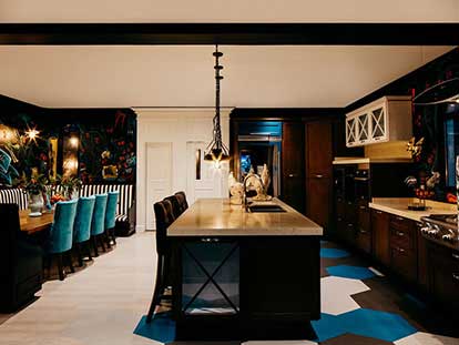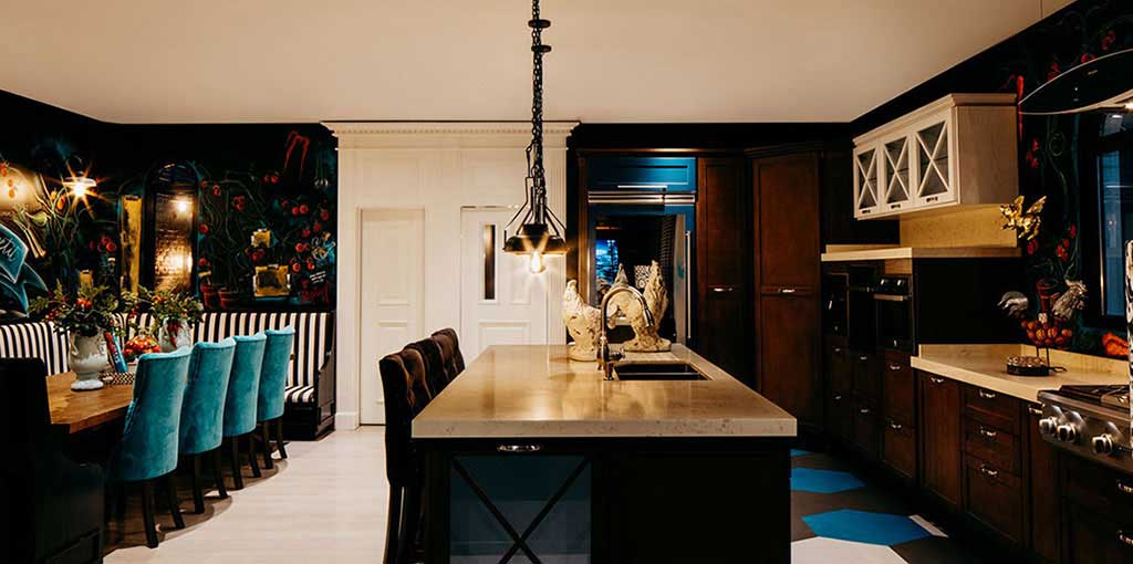 In the kitchen, some walls were chosen where Lily Duclaud decorated with a large and beautiful mural, a long breakfast table, pendant lamps, black and white furniture with emerald green chairs that gave color and elegance to the space.