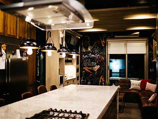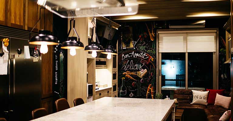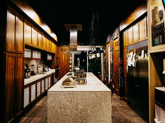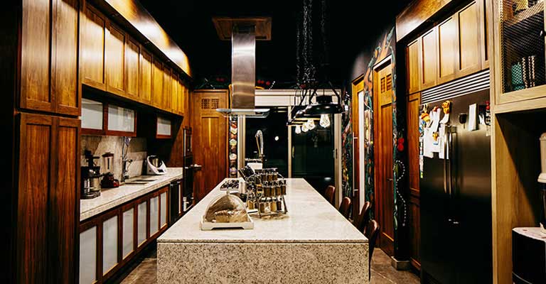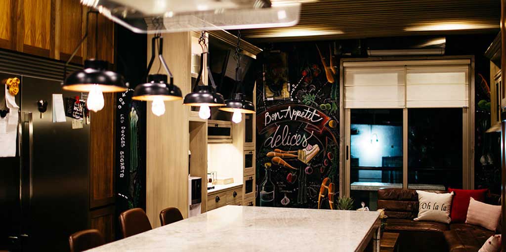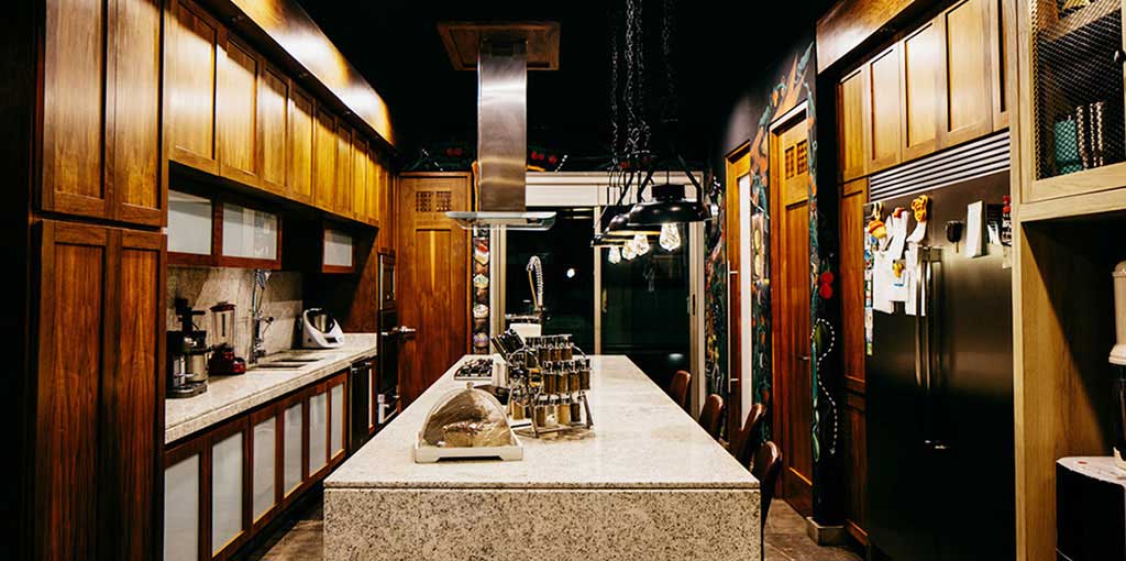 The kitchen, the place that houses infinite stories and memories, was the place where Lily let her imagination fly with a large mural that covered some of the walls. In this same room a small and beautiful place was placed with beautiful leather armchairs, cushions and a bookcase with tv.