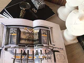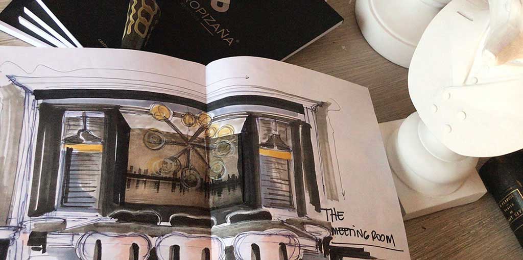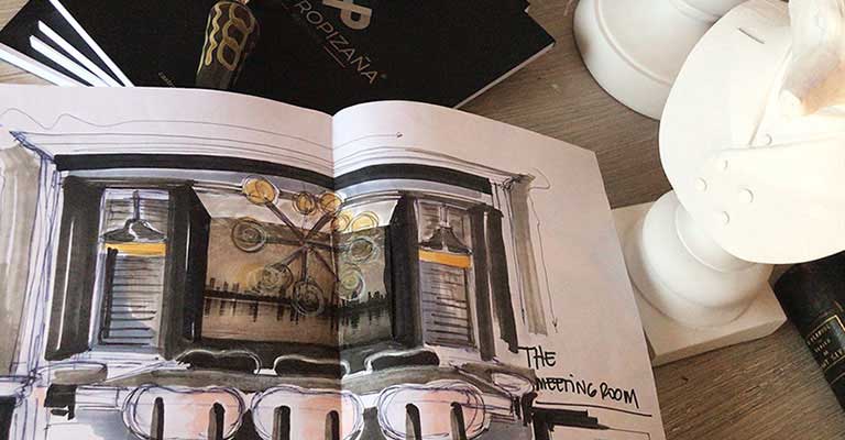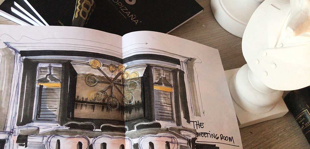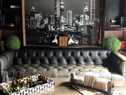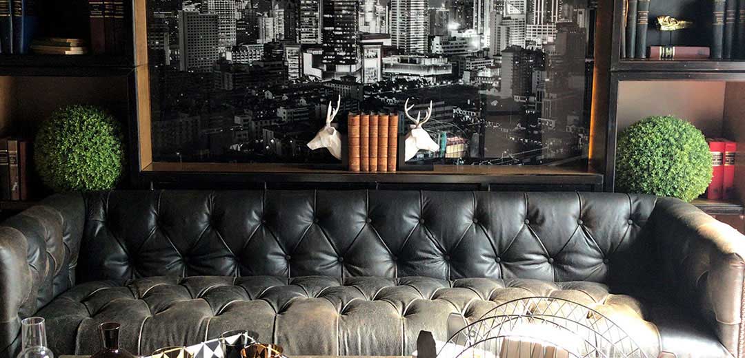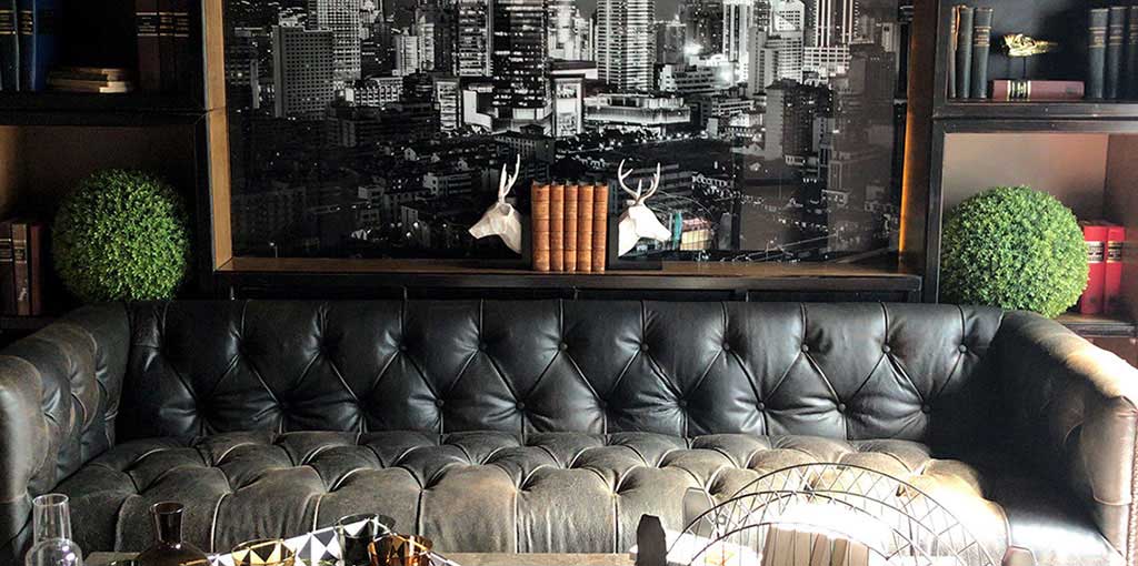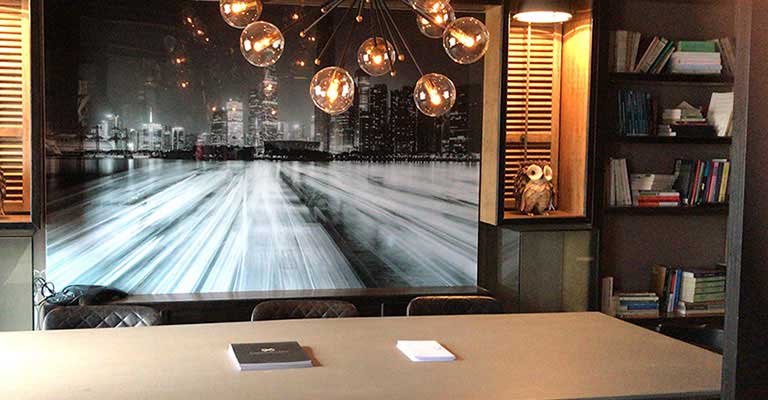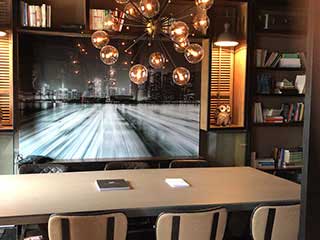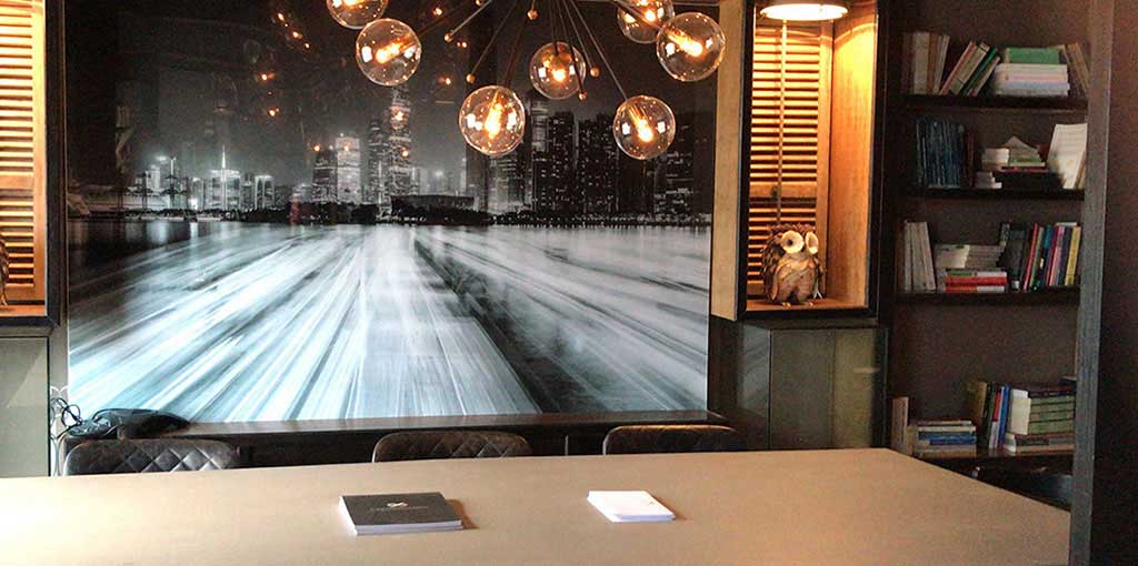 Upon entering, a large circular vintage table at the hall, it is decorated with books and unique pieces, as well as a large industrial chandelier that hangs over the table, gives you the entrance to this large office. Making use of long upholstered leather armchairs, wooden tables, rugs and a beautiful bookcase, we made a fantastic workplace.