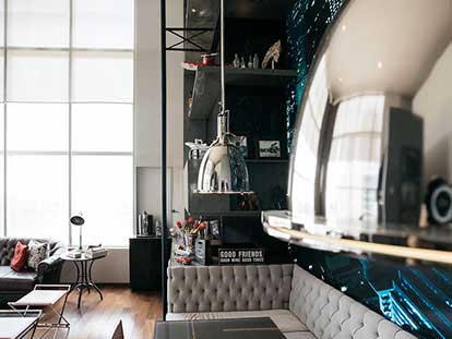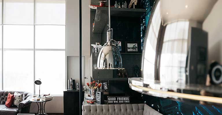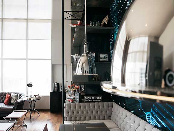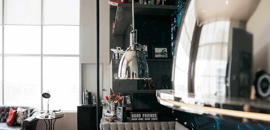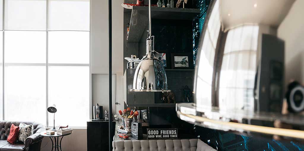 This time we chose a beautiful wooden floor, white walls and furniture incorporating a little reddish tones to give a unified, comfortable and elegant visual appearance. In terms of lighting, fantastic chrome lamps were chosen that hang from a high ceiling, which we took advantage of to include a large bookcase decorated with books and collectibles from our client. We added some occasional furniture with more pieces that characterize the tastes and hobbies of the duel of this incredible space.