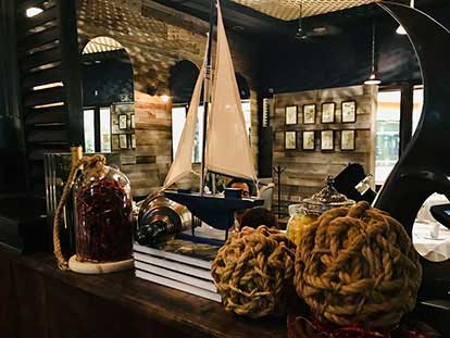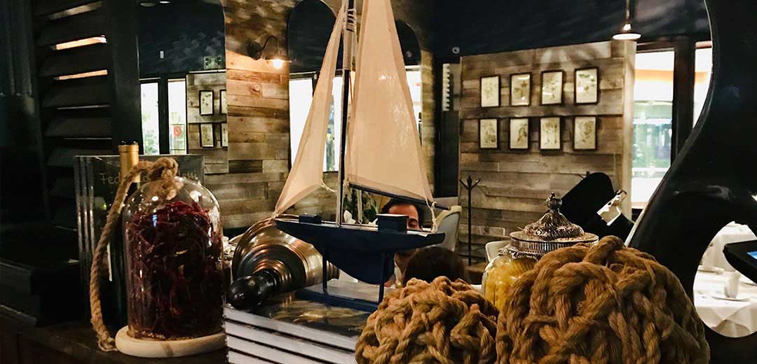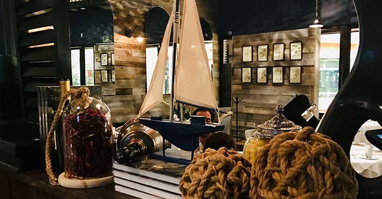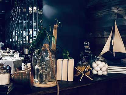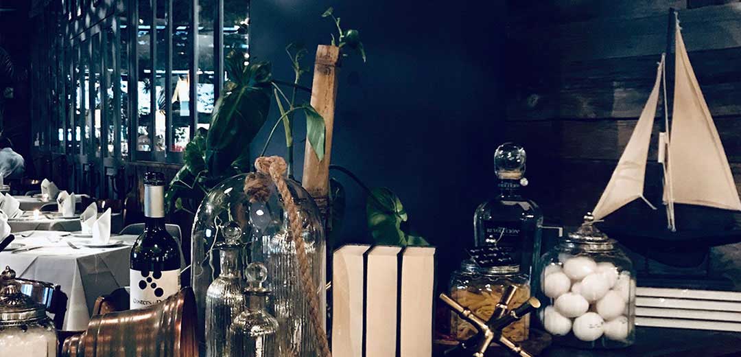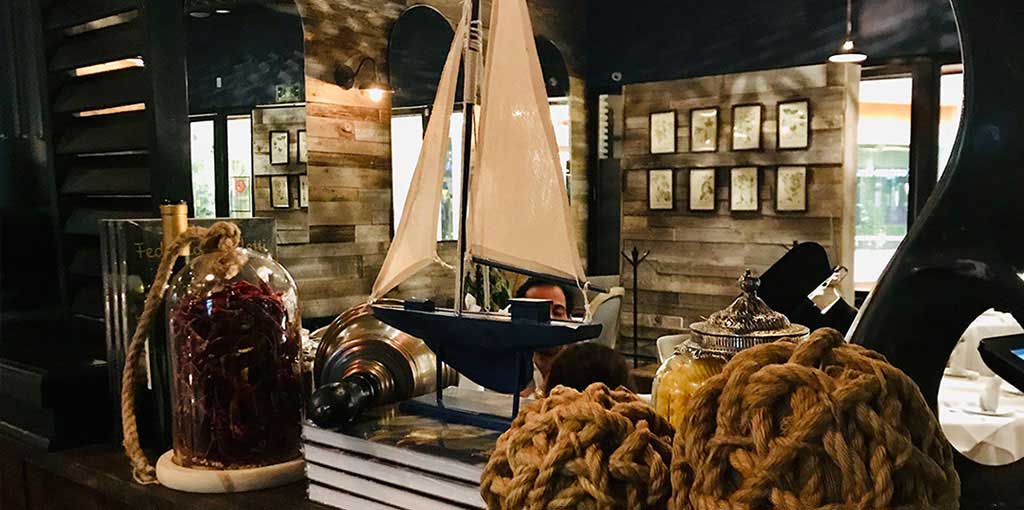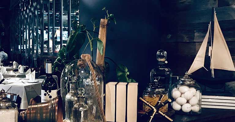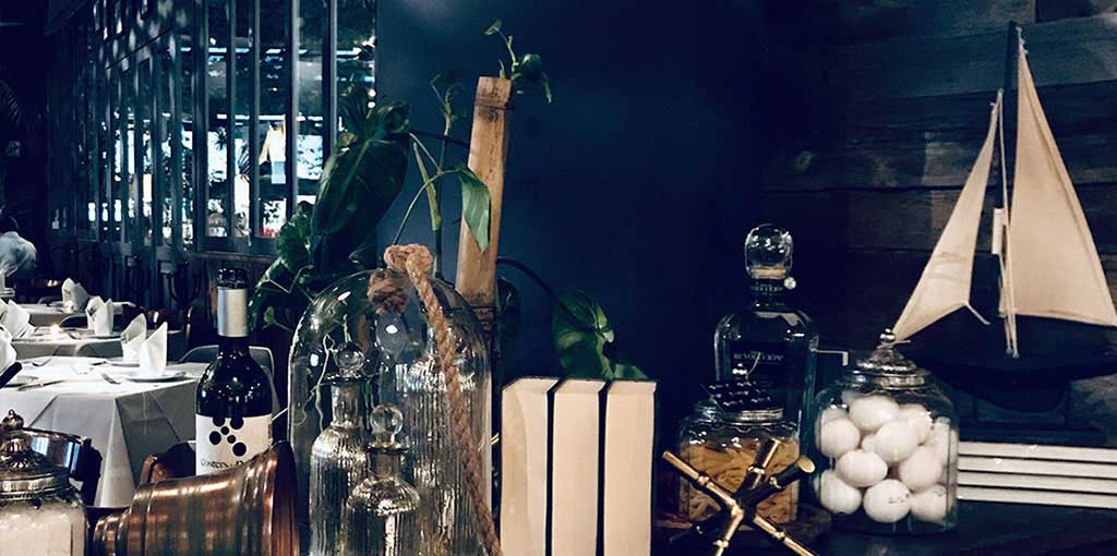 as well as the large green velvet upholstered armchairs that give a touch of color and comfort. Lamps, hanging plants and large mirrors are also part of the decoration.