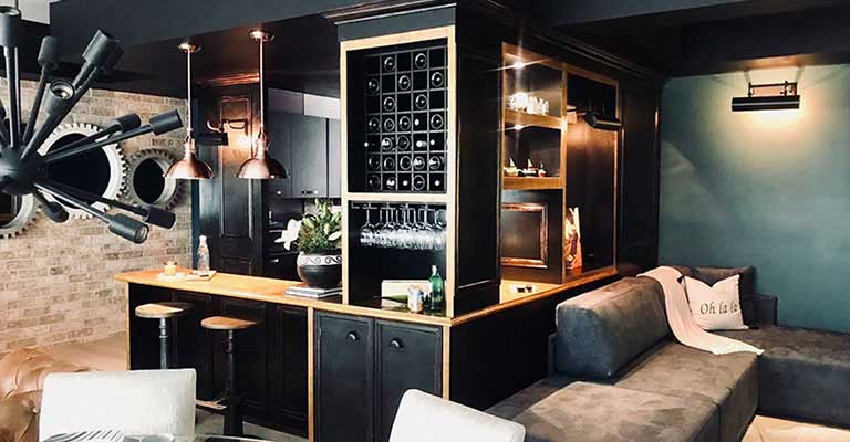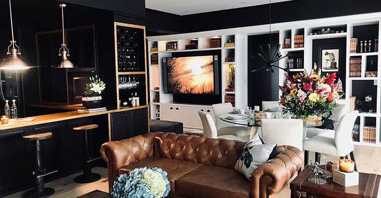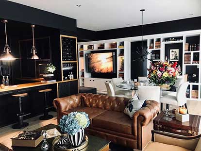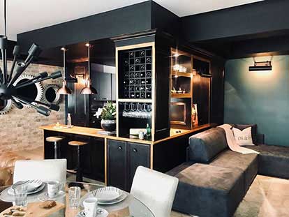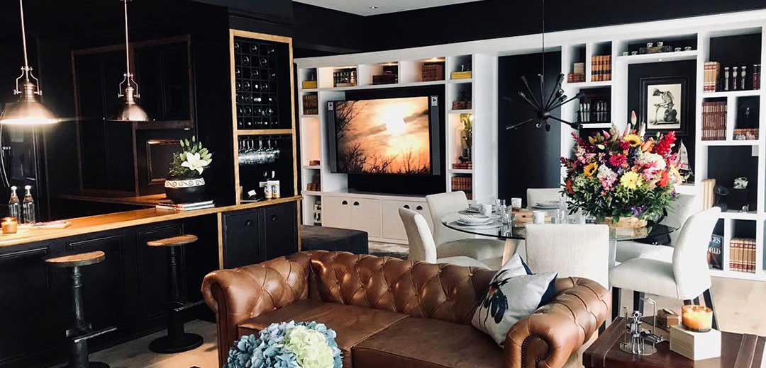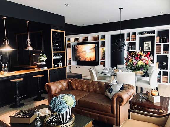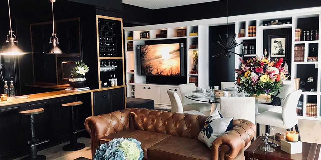 With walls in classic blue and brick tones, impressive gear-shaped mirrors were incorporated that covered an entire wall giving it great prominence, leather armchairs, a coffee table in the shape of books, and decoration elements in cream colors to contrast and achieve a visual and elegant balance.